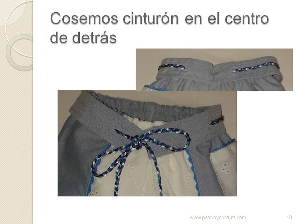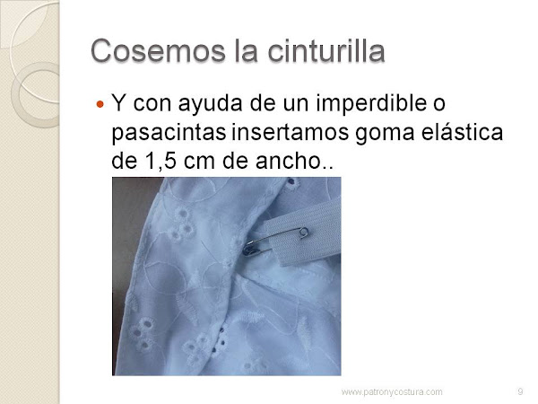 6. Cortamos pieza alargada de 3 cm con el largo de la cintura, cosemos en la línea de la cintura encarando los derechos, damos la vuelta y pasamos un pespunte a 2 cm remetiendo formando el hueco para insertar goma elástica.