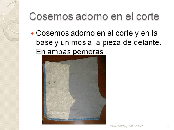 5. Unimos las piezas, cosemos bolsillo de parche, unimos perneras y por último cosemos costura central.