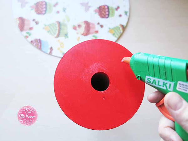 Y cuando ya tenemos los dos elementos que forman la bandeja listos y preparados, los pegamos con la pistola de silicona caliente, le damos bien de silicona por todo el pie de la bandeja y pegamos el plato decorado en ella.