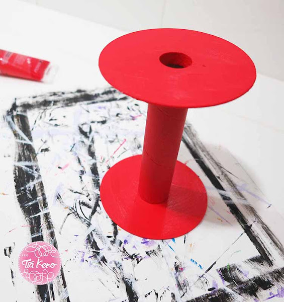 Vamos a pintar la bobina de color rojo, con pintura acrílica roja damos un par de manos por toda la bobina y la dejamos secar un mínimo de 12 horas.