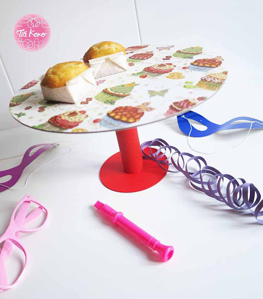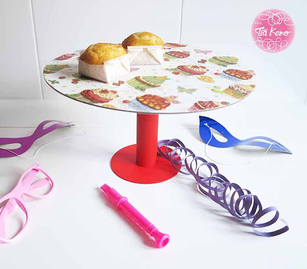 Y ya tenemos esta manualidad infantil fácil y útil lista para ser usada, mirad que mona queda, de momento con las magdalenas del desayuno, mientras espera a ser ocupada por esa tarta maravillosa de la fiesta de cumpleaños.