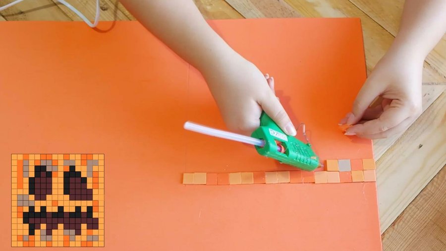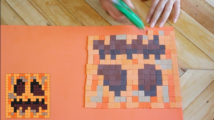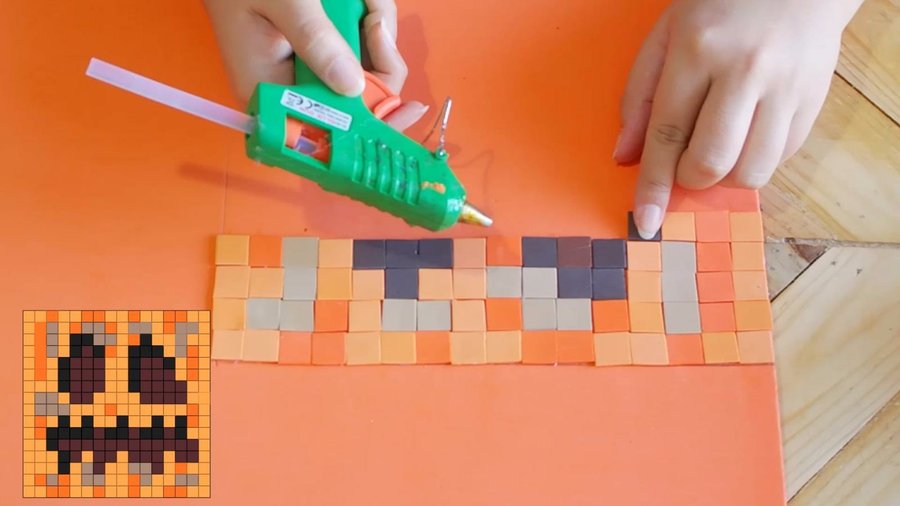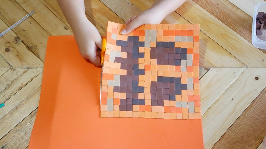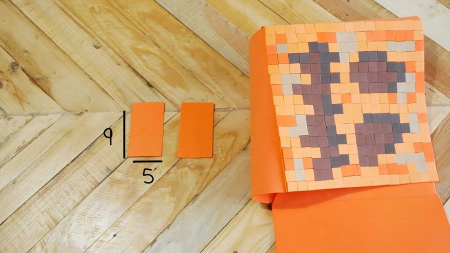Una vez determinado el tamaño y tengamos dibujado el cuadrado, procederemos a cortar todos los "píxeles". Yo os aconsejo que contéis los que aparecen en la imagen que os dejé en los materiales y así no haréis más de la cuenta. El proceso es muy sencillo, hacer una cuadrícula e ir recortando cuadrados de los colores necesarios.