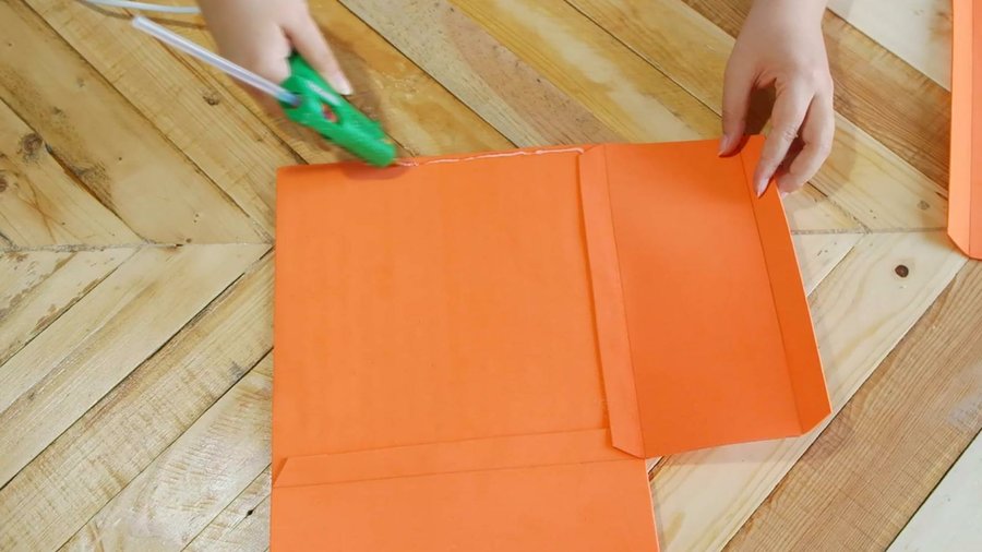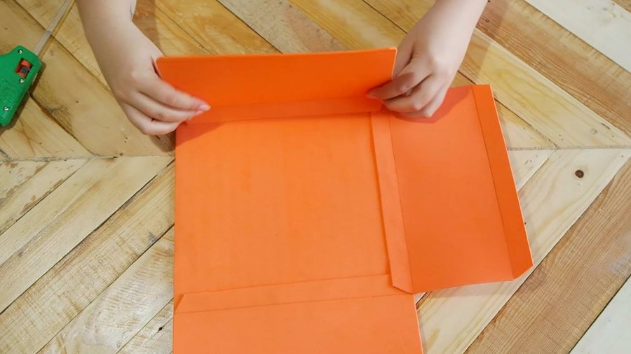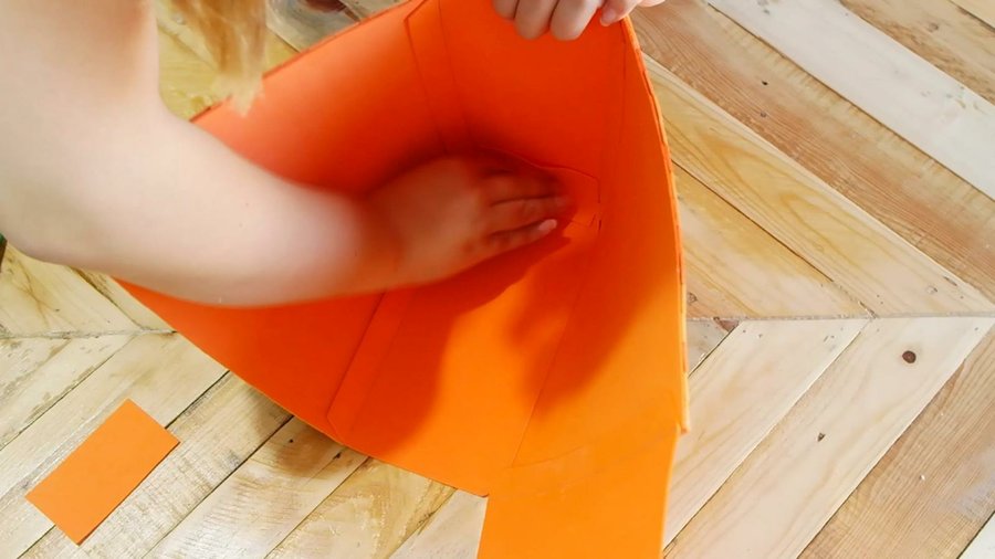 A continuación empezaremos a montar nuestra bolsita, pegando las solapas a la cara de nuestra calabaza.