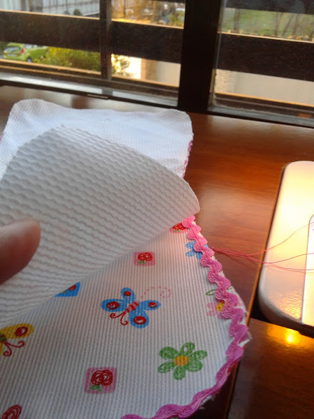 Después colocamos derecho de la parte lisa con el derecho de la parte estampada. y cosemos por la parte donde cosimos el pespunte de la piconela, tratando que quede bien estirada la tela y haciendo coincidir todos los bordes, dejamos una abertura de 5 cm por donde damos la vuelta y rematamos a mano.