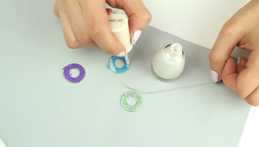 - En principio debemos coger unas arandelas, que serán las protagonistas de nuestras pulseras, y decorarlas con pintauñas.