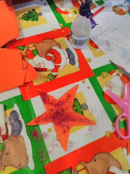 Se pone pegamento encima en la estrella y sobre éste, echaremos purpurina para que quede fijada.