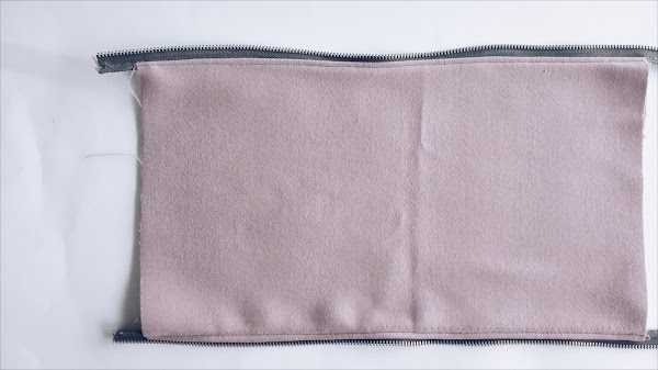 4. Harás otro sandwich más, alineando la tela exterior por delante de la cremallera y la tela interior alineada con la cremallera por detrás. Y repite...un pespunte con pie de cremallera y otro pespunte por el exterior para asentar costuras.