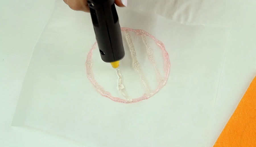 -En el tercer paso lo que debemos hacer es seguir con la silicona caliente las medidas que hemos hecho sobre el papel de horno. También crearemos con ella el bastoncillo con el que lo colgaremos en el armario.