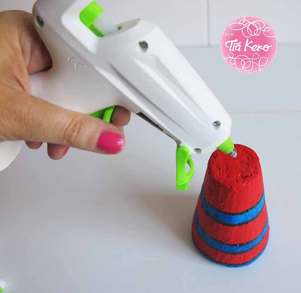Y ya llega la hora del montaje final, con la ayuda de la pistola de silicona caliente pegamos la tapa en la parte de arriba del cono y lo dejamos secar.
