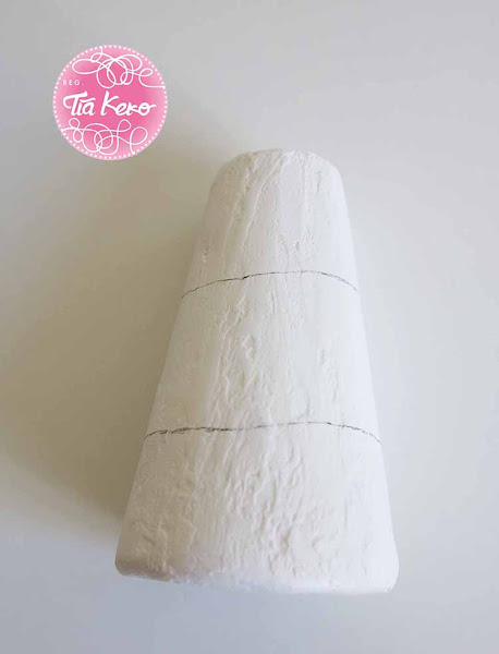 Ya sabeis el tacto granulado que tiene el corcho blanco y es difícil de pintar, así que para poder pintarlo bien preferimos cubrirlo entero de mascarilla de yeso, la misma con la que se sellan agujeros en las paredes, esa misma, poco a poco vamos cubriendo todo el cono de corcho blanco, intentando que quede lo más regular posible, aunque no se si nosotras lo conseguimos del todo, yo creo que no mucho, pero bueno, así quedó.