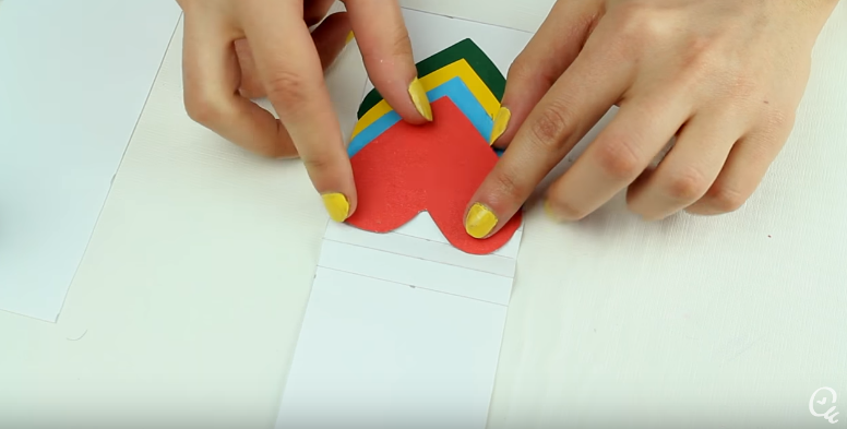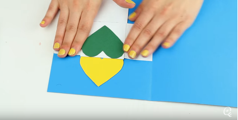 4.- A continuación le pegamos sobre el folio con corazones otra tira de folio, así conseguiremos crear un mecanismo en el que al tirar del folio además del mensaje que escribamos se mostrarán los corazones. Esto lo pegamos en el interior de nuestra postal.
