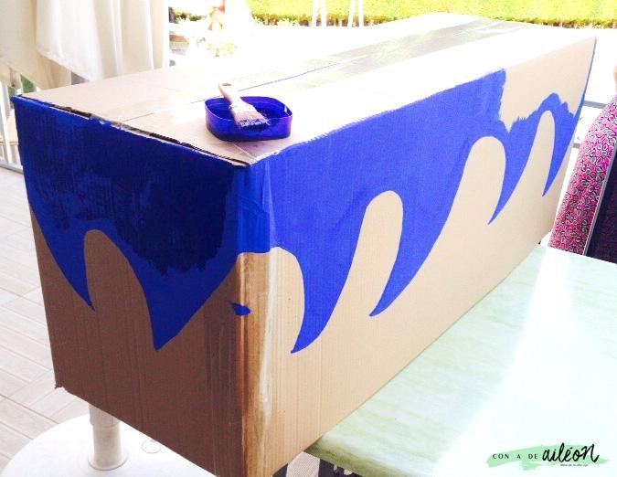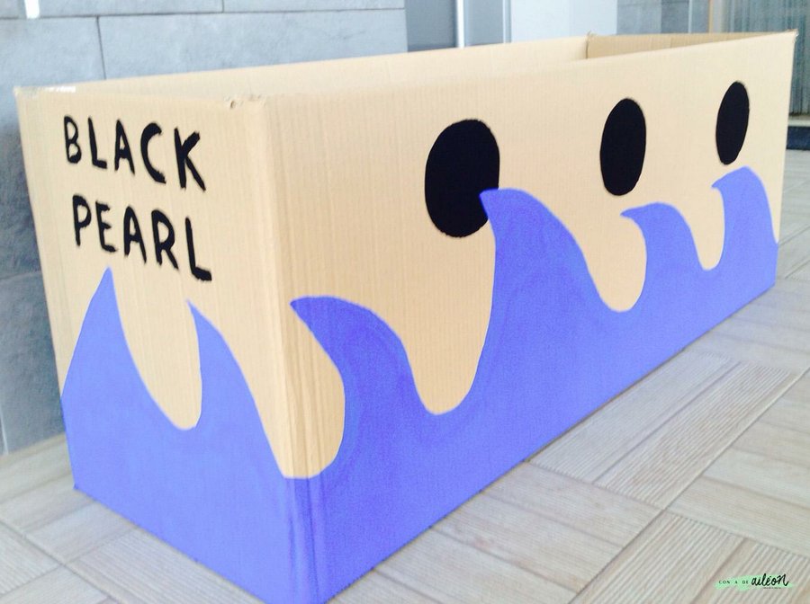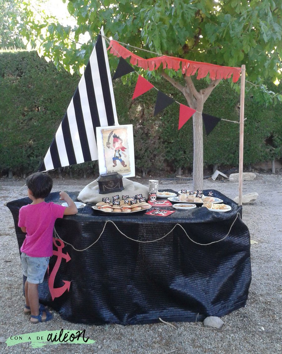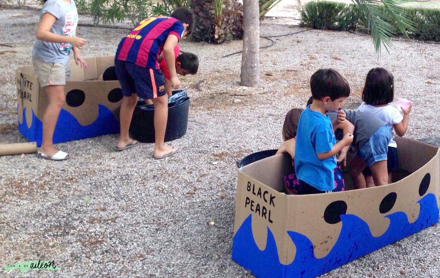 Aparte de todas las ideas que hay en cualquier tienda de celebraciones para vasos, servilletas, adornos, etc, solo necesitamos un palo, una tela de rayas, tela negra, cartulina y cordel para hacer esta mesa donde se pondrá la merienda: Por otro lado, y a pesar de ser verano y tener piscina, por si querían divertirse un rato, decicimos hacer unos barcos piratas para hacer una guerra de globos de agua. Basta con tener un par de cajas grandes y pintarlas con olas y agujeros como se ve en las imágenes.