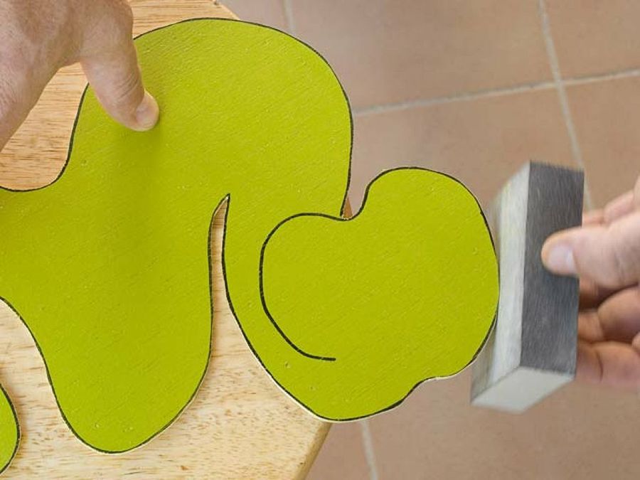 Para eliminar las astillas y asperezas en el borde de la figura, le damos un repaso con el taco de lija, utensilio que nunca debe faltar en nuestro rincón de manualidades.