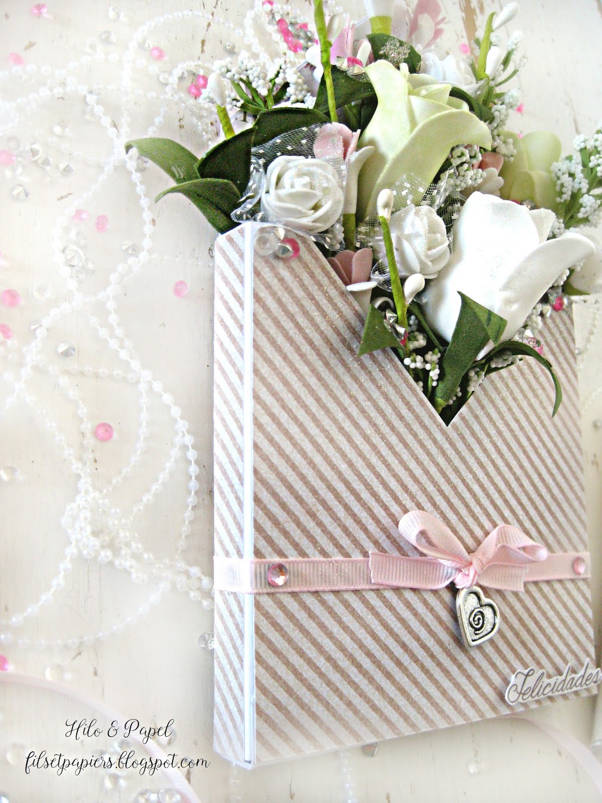 Si queréis añadir una nota podéis usar un tag y colgarlo entre las flores; si el sobre es mucho más grande podéis poner una tarjeta (como los que se ponen en los ramos de verdad) o añadir un pequeño espacio detrás para escribir.