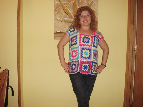 ¡¡¡¡ Te traigo una sorpresa ¡¡¡¡ eso fue lo primero que me dijo mi madre cuando entro en mi casa y al sacar de la bolsa este jersey de ganchillo hecho por mi madre , me dio una alegria, es un jersey tan bonito y con unos colores muy alegres.El jersey esta hecho a ganchillo con hilo de perle de colores, ha ido haciendo cuadros XL o grannys gigantes y los ha ido uniendo , cada uno de diferente color ...