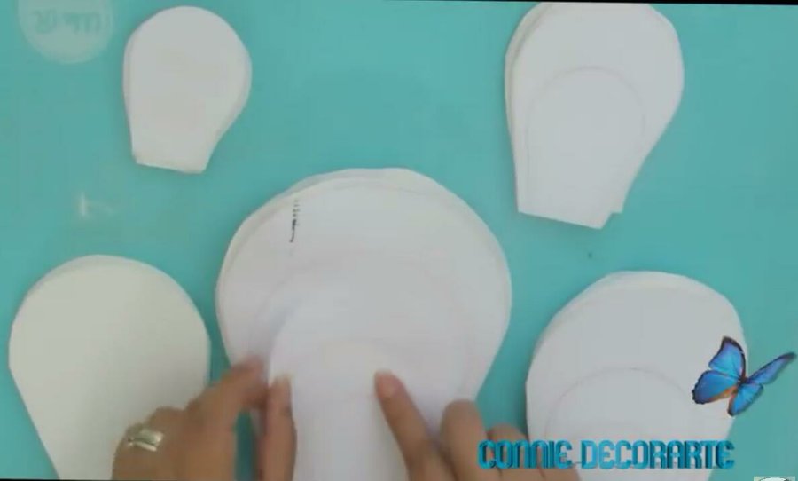 Cortamos 5 pétalos de cada uno, no usaremos el mas grande, si no cortaremos un intermedio del tercero para que nos queden 5 lineas de pétalos ( como se muestra en el vídeo )