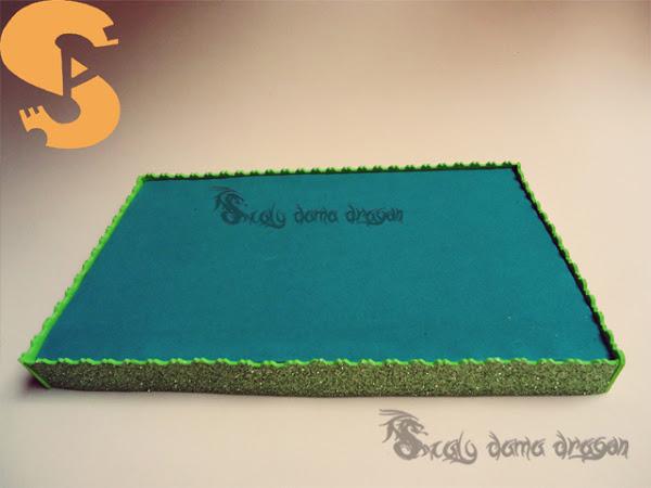 La Base esta hecha de una base de Unicel cortada en rectángulo y luego forrada de Foamy color verde con la orilla escarchada en otra tonalidad.