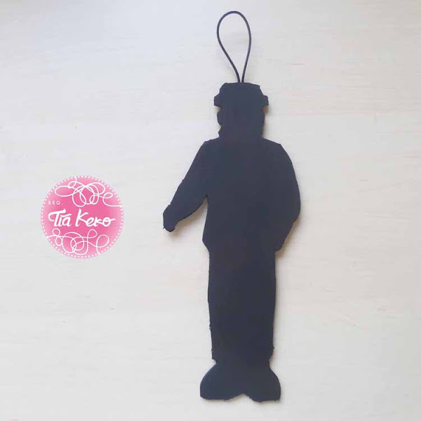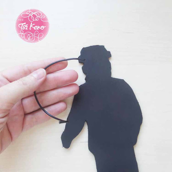 Para poder colgarla de la puerta, vamos a coger un trozo de cordón y con la pistola de silicona caliente lo vamos a pegar en la parte trasera del Frankenstein y lo dejamos secar bien.