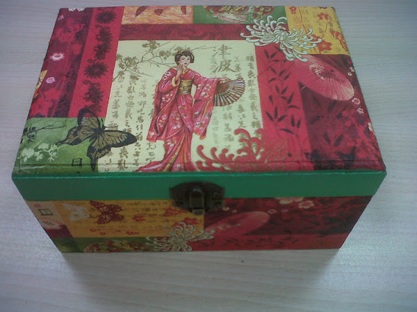 CAJA CON GEISHACajita de madera decorada con servilletas, técnica de decoupage.