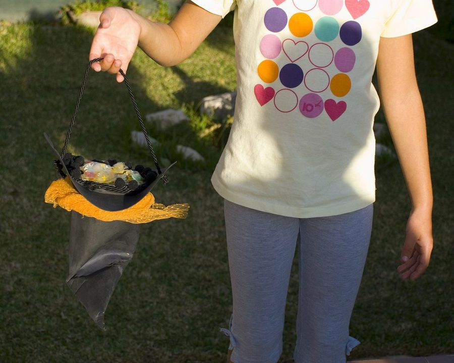 Las tareas habituales se dividen en dos categorías: la decoración en las casas y los disfraces de los peques. Un detalle esencial del atuendo es el complemento para guardar las chuches. Siempre a tono con el espíritu de la fiesta, puede ser una bolsa decorada con motivos espeluznantes, o una cesta en forma de gorro de bruja. Escogeremos esta graciosa idea para nuestro diseño.