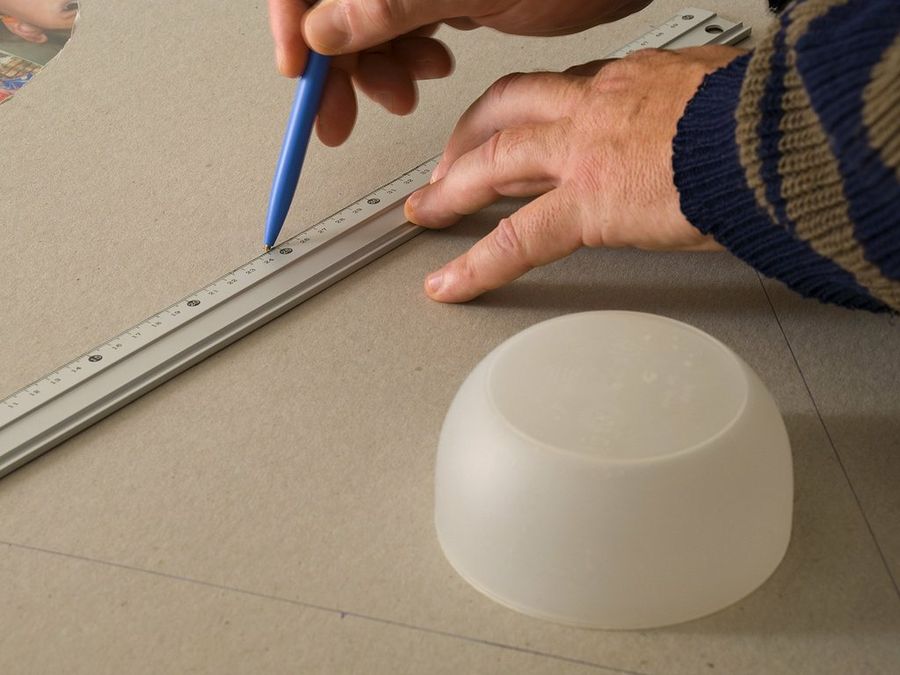 Comenzamos la tarea fabricando el ala, para lo que dibujamos una circunferencia en el cartón, con la ayuda de cualquier objeto redondo. Hay muchos en la cocina, basta elegir uno de tamaño adecuado a nuestro diseño.
