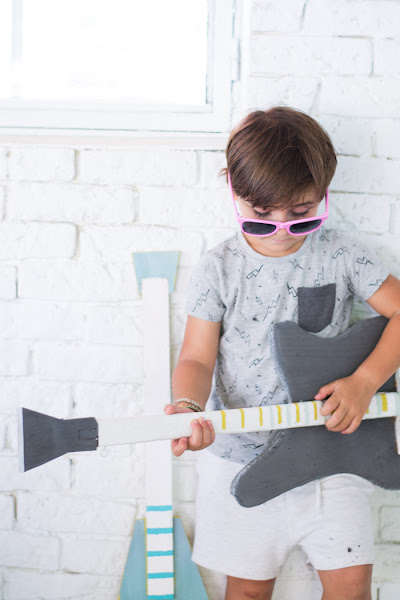 Mi padre busco retales de madera y con un cartón hicimos unas plantillas, de dos tipos de guitarras diferentes. Mi padre montó las piezas y yo las lije y las pinté, no tengo ningún mérito. El micrófono también se lo hizo y Lucas quería uno de los antiguos, y el resultado fue muy logrado.
