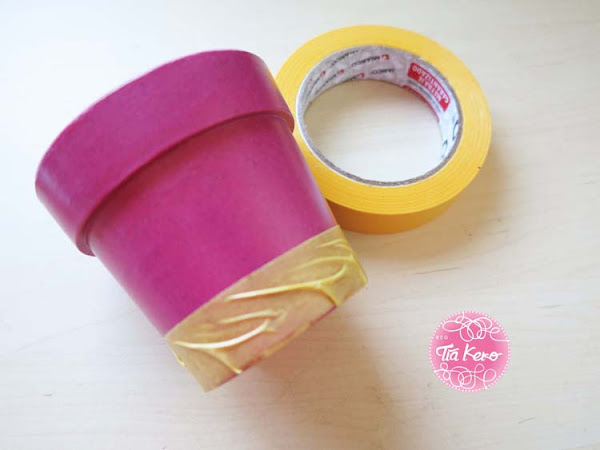 Vamos a limpiar muy bien la maceta quitando todos los celos, etiquetas y pegamentos que pueda tener. Una vez está limpio y seco, vamos a delimitar la zona de la maceta que irá pintada. Y eso lo haremos con ayuda de la cinta Washi de Miarco, está fabricada con una combinación de papel de arroz y adhesivo que la hace ideal para utilizar en trabajos de precisión porque al levantar no se lleva la pintura y se adhiere a cualquier superficie.