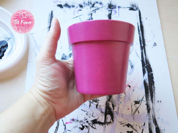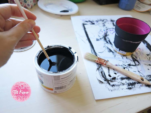Y comenzamos a pintar, como queremos hacer que esta maceta sea de pizarra (últimamente nos ha dado por esta pintura, pero es que nos encanta), primero vamos a dar una mano de pintura acrílica negra y después dos manos de pintura de pizarra.
