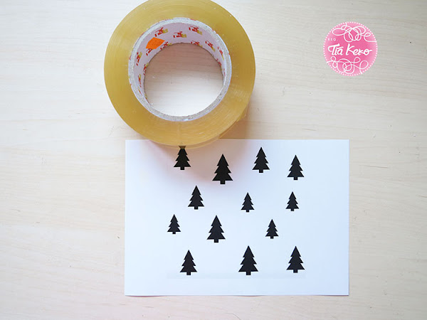 Una vez tenemos la página forrada de cinta de embalar comenzamos a cortar con un cutter todos los abetos de navidad.