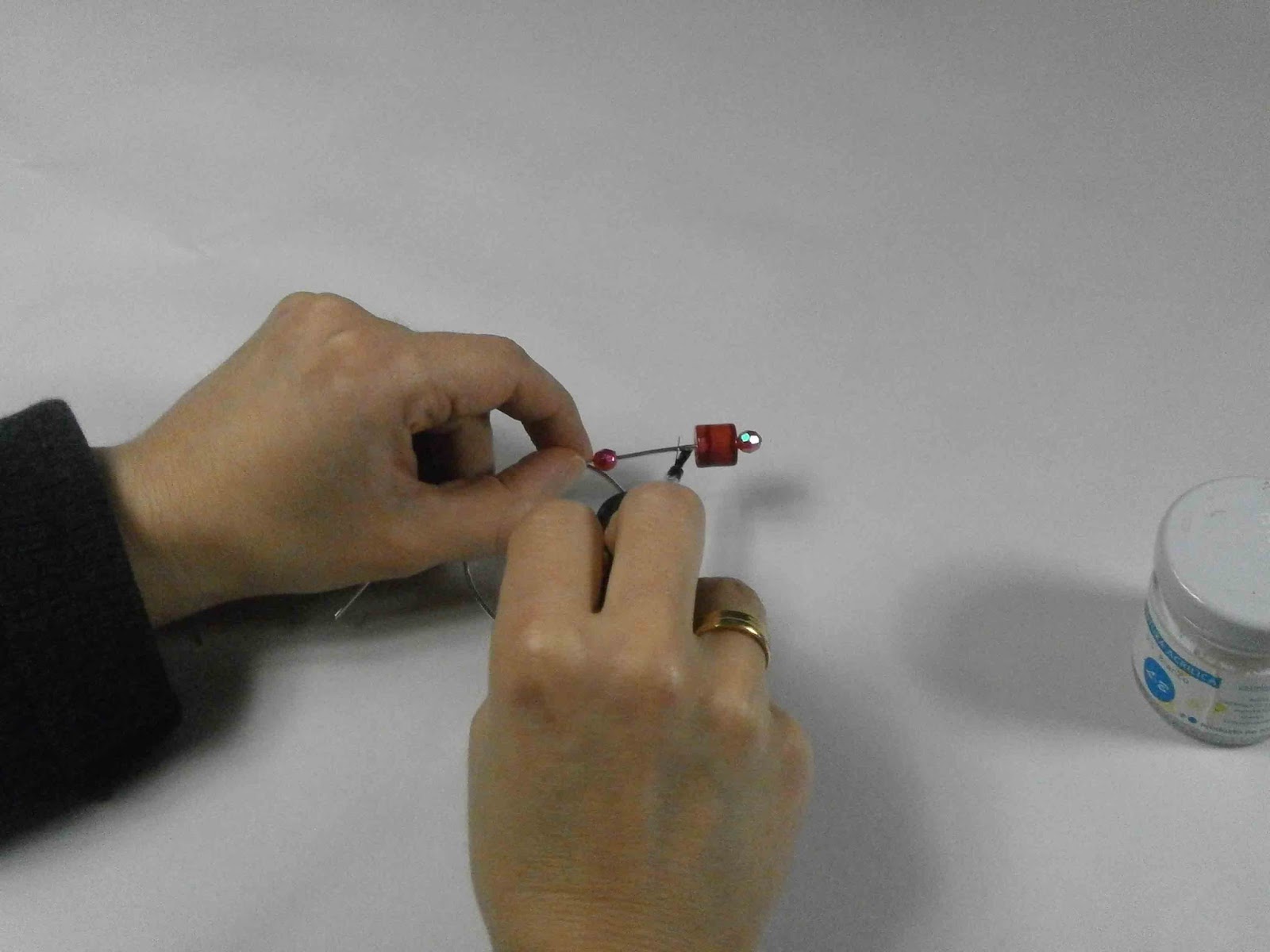 Acabé de cerrar del todo el alambre, ya con los abalorios puestos. Y por último le até un nudo con un lacito rojo.
