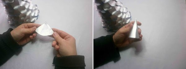 Con la ayuda del lápiz se hace una pequeña doblez a las piezas y a continuación se va pegando alrededor del cono de cartón.