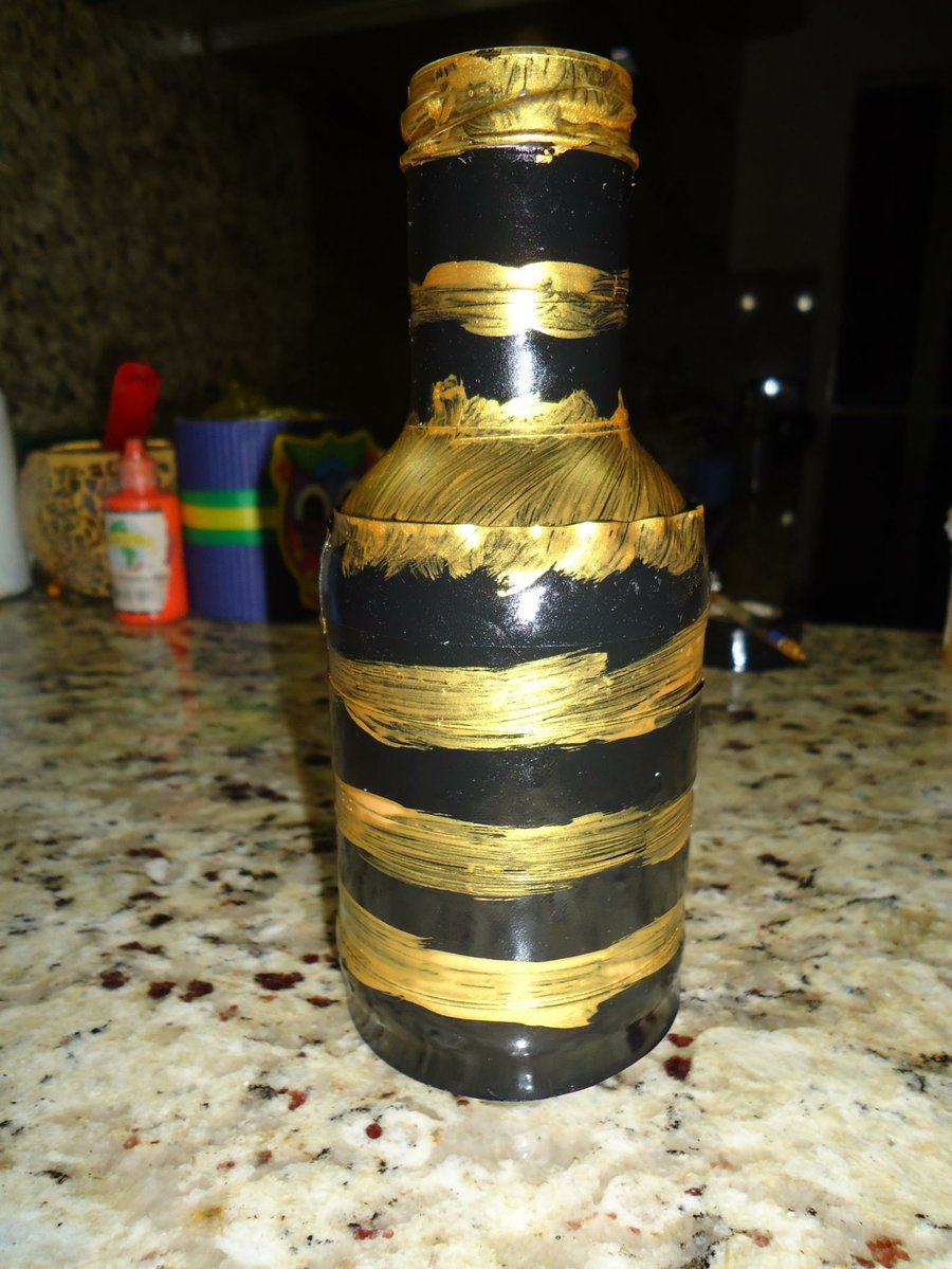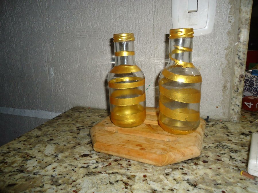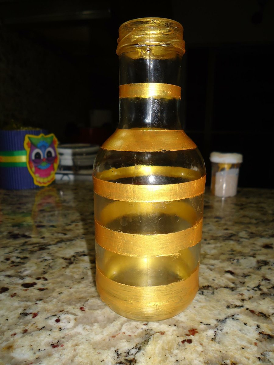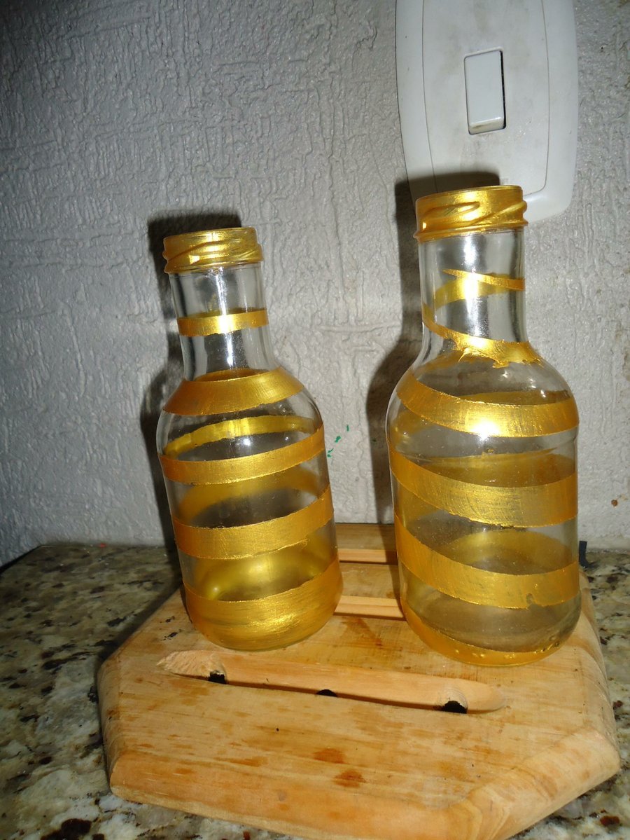 1.- Colocar el teipe con el diseño deseado sobre la botella. En este caso de elaboraron sencillos espirales con espacio en cada vuelta, y se varió dicho espacio para dar diferentes erminaciones