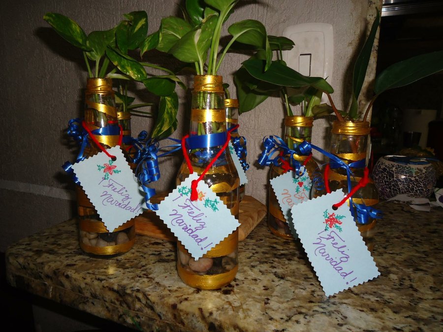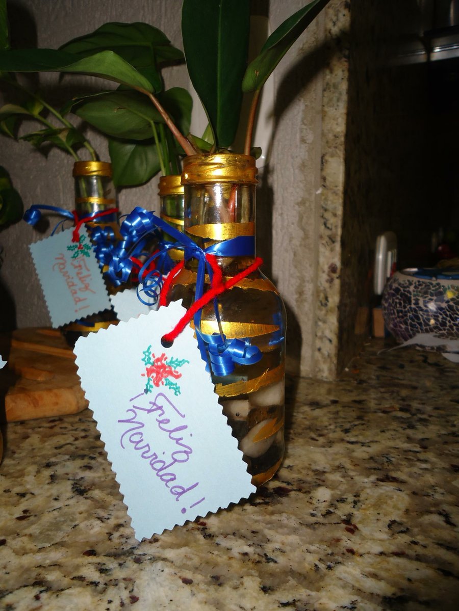 5.- Se elaboran pequeñas tarjetas para hacerles la dedicatoria, un mensaje personalizado, alusivo a la ocasión a regalar, en este caso son navideñas. Estas tarjetas se sujetan al cuello de la botella con un pequeño trozo de estambre.