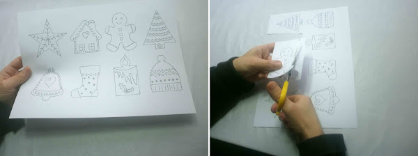 Guíate por las plantillas para dibujar las galletas con el rotulador corrector. Si quieres puedes hacer tus propios dibujos. Finalmente pasa una aguja con hilo y haz un nudo para poder colgarlo en el árbol de Navidad.