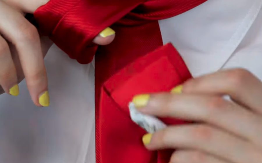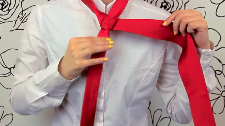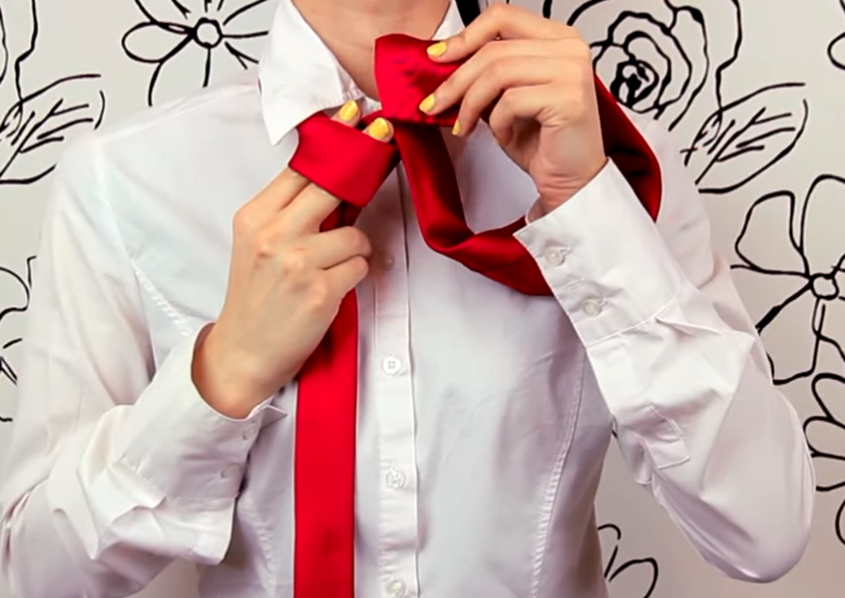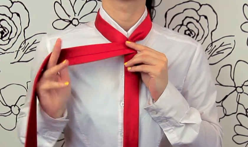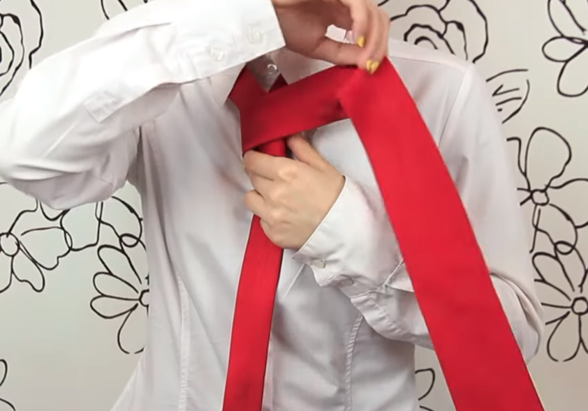 3. Toma el nudo por detrás, amplía la abertura hasta hacer un agujero y pasa el extremo trasero por él. Voilá!