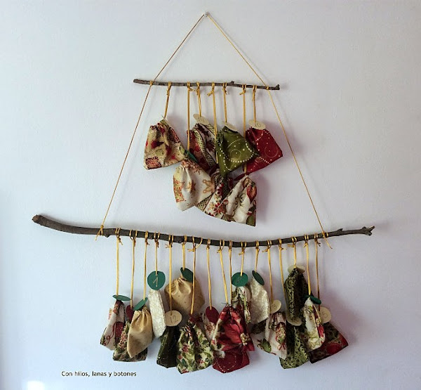 Pinté los días con tempera , resaltando el día 24, aproveché que debajo de casa estaban podando y le pedí al jardinero que me cortara dos trozos iguales de una rama, y con cordel sujeté la tela por arriba y por abajo!!