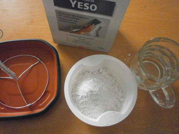 Yeso, un recipiente de plástico, un palo de madera y una aguja.