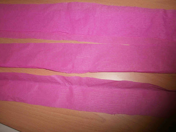Corte tiras de papel crespón de unos 7cm de ancho para ponerlas unas encima de otras, esto serán las flores de una bola.