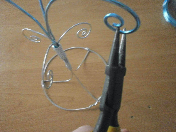 Doble el alambre azul un poquito y enrosque también las puntas con las tenazas.