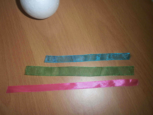 Corté tres tiras desiguales de lazo porque quería dar un efecto desigual al colgar las bolas de poliespan.