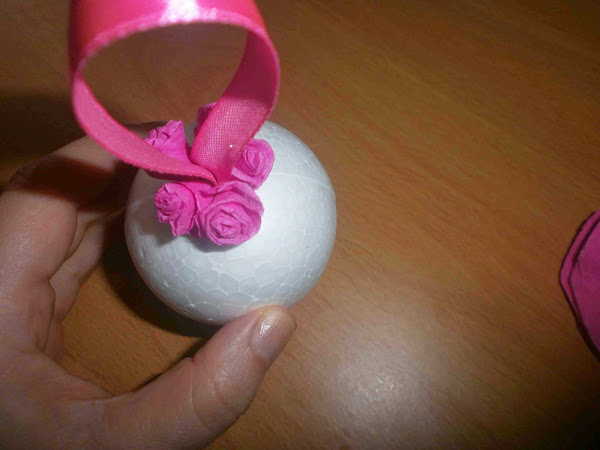 Con la ayuda de un palito de madera con punta le hice un agujero a la bola, introduje el lazo asegurándolo con silicona para que no se saliera.