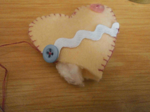 Luego a la tripa de pollo le cosí un botón y al corazón de fieltro otro botón.