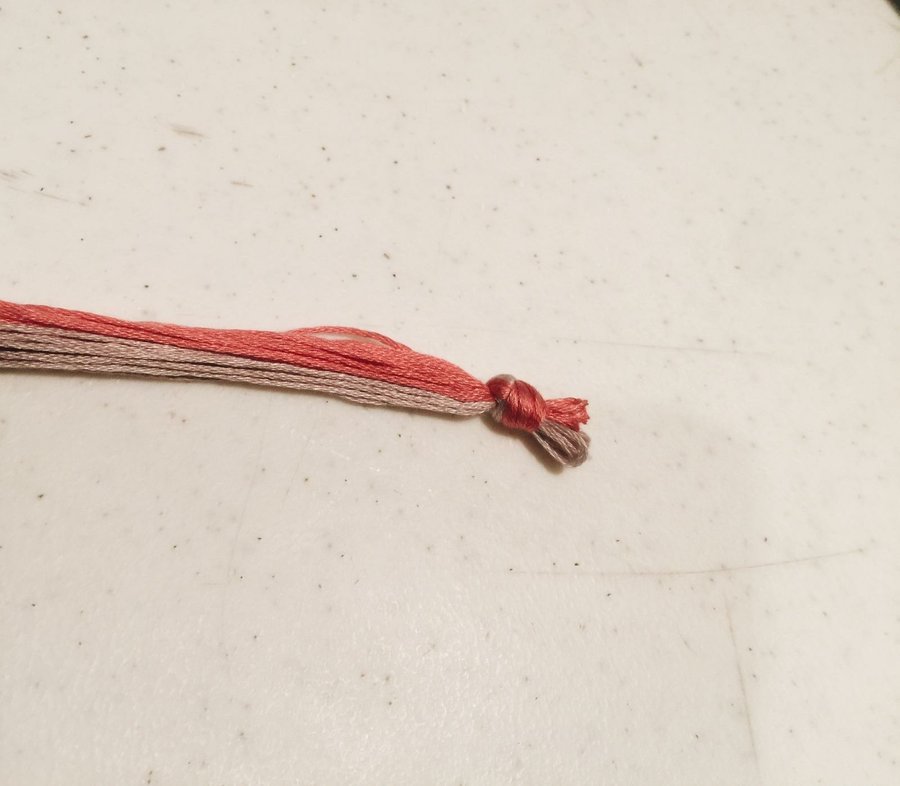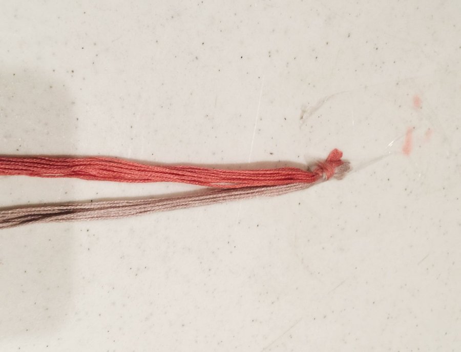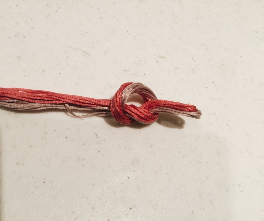 4.- Ahora unimos los dos extremos con un nudo bien apretado. El nudo debe quedar justo al principio para que no nos falte hilo.