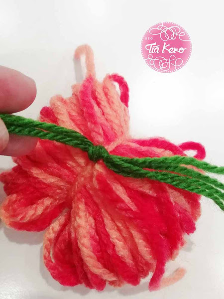 Ahora cogemos dos trozos de lana verde y los atamos con otro nudo en la parte superior del pompón de lana.