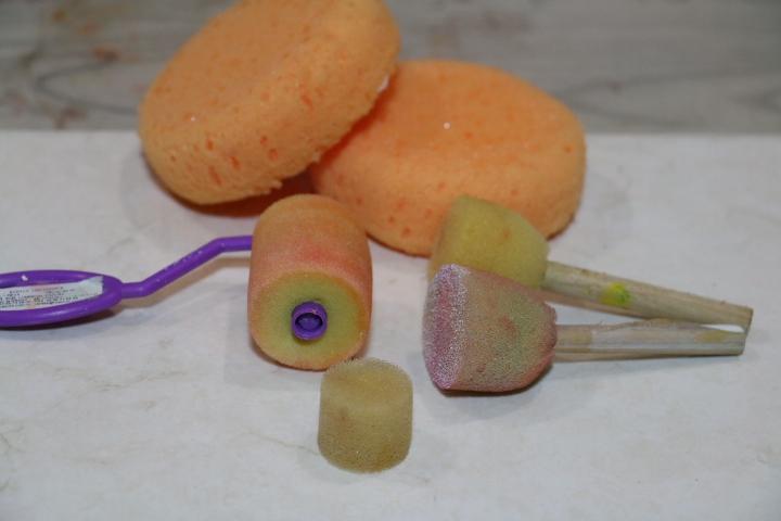 Las esponjas son una de las herramientas más indispensables como vez en la foto de arriba hay de diferentes tamaños y formas, La más pequeña que ves es una esponja que venia en un botesito de pastillas y la verdad es que cuando necesito esponjear algo pequeño la uso, también esta la del rodillo que es tan efectiva cuando quiero quitar la marca del pincel. Y por supuesto mis básicas son las redondas o de hamburguesa, algunos efectos que puedes hacer es el marmoleado.