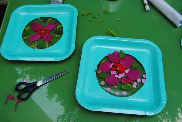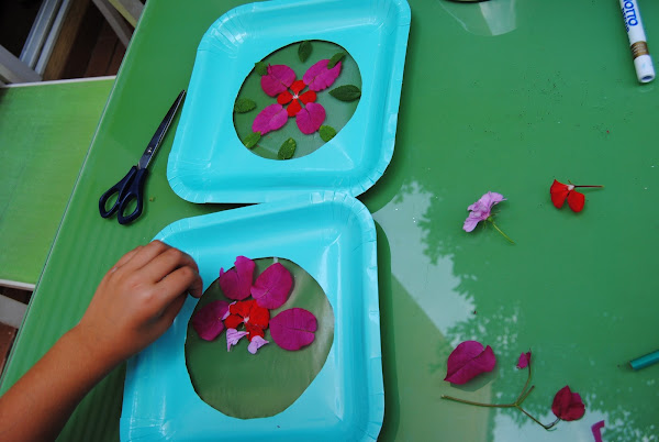 Platos de cartón, forro de libros (puedes aprovechar restos del año pasado), pétalos de flores y hojas de plantas.