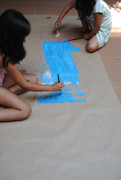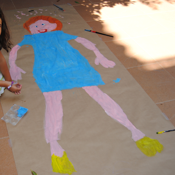 Copiamos el perfil de la persona con una cera de color. Para eso, deberás tumbarse en el suelo, y dejar que alguien copie su perfil. Una vez copiado, podemos empezar a pintar.