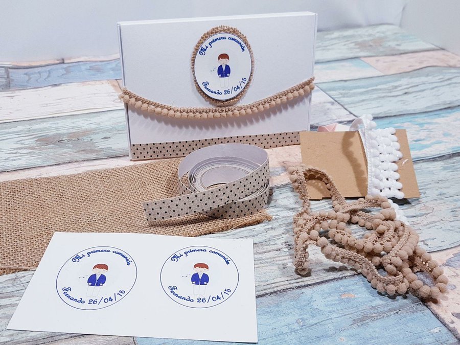 A estas cajitas, al ser en color blanco le agregué también los madroños por la solapa pero en esta ocasión utilicé el color camel para que hiciera contraste y quedara a juego con la tela de arpillera que puse debajo de la etiqueta personalizada y con la cinta washi que pegué en la parte inferior de la otra solapa.