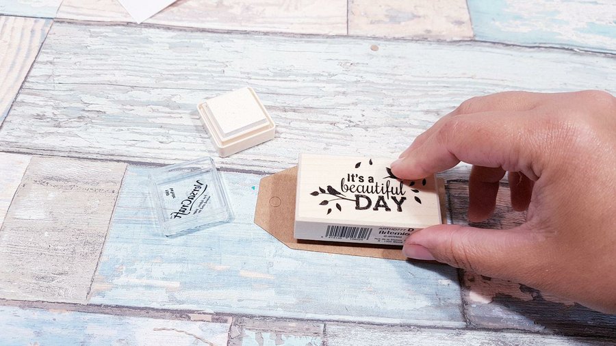 Al igual que en el resto de las cajas le puse la etiqueta personalizada sobre una blonda blanca, una tira de cinta washi por el borde inferior y, como detalle final, en el asa le até una etiqueta de cartulina craft a la que le añadí una puntilla blanca en el borde y le estampé un sello con tinta de color blanco.