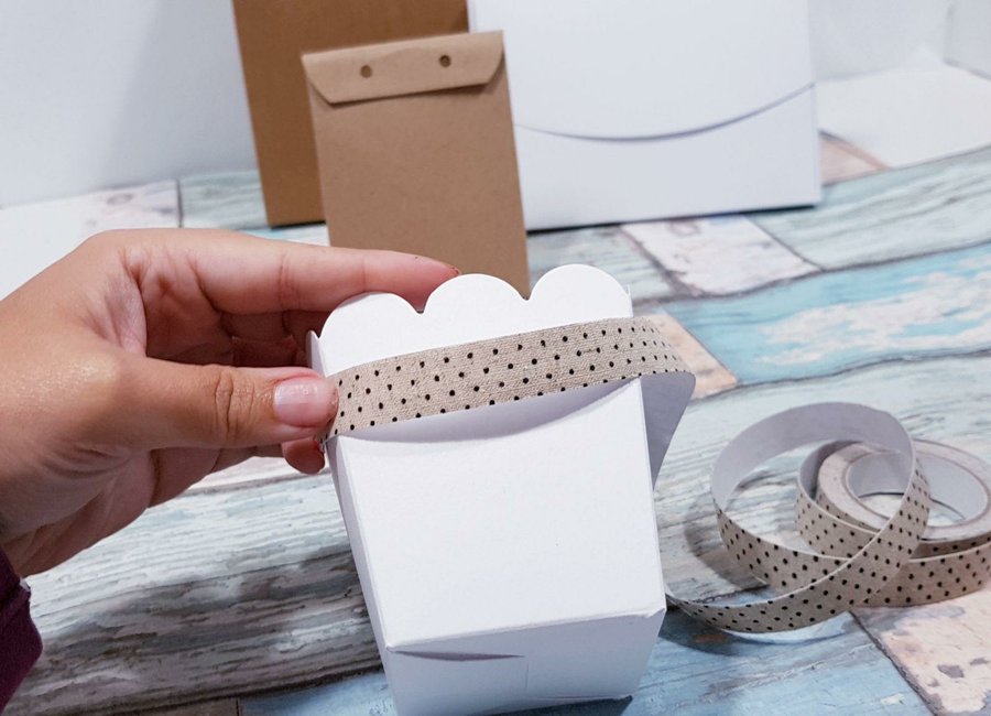 Para personalizar estas cajitas he utilizado una cinta washi con textura de tela de arpillera decorada con unos topitos en azul marino, la cual he pegado por todo el contorno en la parte superior.